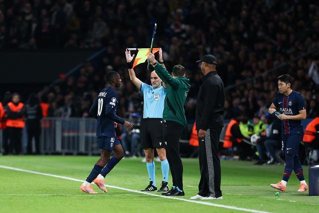 才踢到27分钟,大巴黎就首次举起了换人牌。此前在门前包抄将皮球送入球网、但越位在先的登贝莱,向场边示意无法坚持,而替补席上的李刚仁完全没做好准备,几乎是一脸蒙地仓促换完了球衣和背心,目送登贝莱下场后径直返回更衣室。